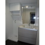本体とミラーキャビネットのサイズを違うものにし、梁に干渉しないようにしました。 壁面に化粧パネルを施工し、違和感の出ないように対応しました。 洗濯機上部には吊戸棚を設置しました。