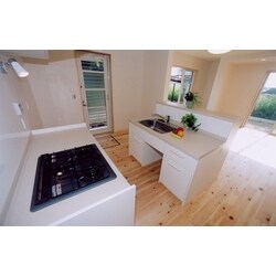 「お父様がベッドで寝ておられる時間が多い」とお聞きしたので、対面キッチンにしてお母様がお父様の気配を常に分かるような位置にしました。また、キッチンに立つとちょうど掃き出し窓から外の緑が見える位置になっています。 高齢の為、お施主様が家におられる時間が多いので、常に外の緑が感じられるようにプランニングしたのと同時に素材選びにも気をつけました。