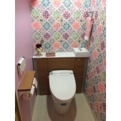 デザインクロスが目を引く可愛いらしいトイレになりました。タンク廻りがスッキリしているおかげか、意外にもごちゃついて見えません。お部屋には躊躇してしまうようなデザインでもトイレのコンパクトな空間なら、アクセントになり素敵な空間を演出します。