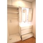 吊戸やラックも含めてご提案を致しました。吊戸は洗面台上の高い位置に設置となりますので、最下段が踏み台になる洗面台機種を選択しました。
