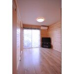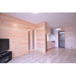 2室の間仕切りをなくし、9畳のLDKにリモデル。 既存の壁はキッチン、冷蔵庫の目隠しとして残した。 キッチンの配置を変えることで収納をまとめ、又押入をクローゼットに変更してタンスを収納し、部屋の凸凹をなくしてスッキリさせた。 お気に入りの桧を壁全体に貼り、床材も桧で統一。サッシも高くして部屋が明るくなるようにした。