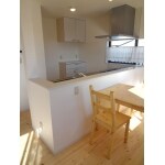 明るい南側に向いたペニンシュラ型キッチンを配置し、北側に浴室、トイレ、洗面、洗濯機置き場を設計しました。 リビングは約8畳の広々スペースを確保しました。