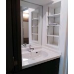 鏡はそのままで洗面台の交換をご希望でした。 シンプルでも高級感があるほうがいいと仰ってました。 収納棚も新しくしたいとのことでした。