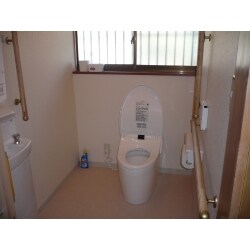 2室に分かれたトイレを撤去し、大きな空間にしました。入口も大きく開口できる扉に替え、将来の車イスでの使用も可能になりました。