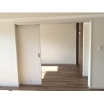 和室を洋室にリフォーム。畳は無垢の風合いのフローリングに替え、襖は3連引戸に交換しました。