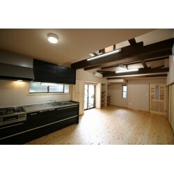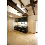架構を変更した箇所や劣化している箇所の骨組みは補強し、構造強度を増す。出入口や洗面室、浴室の床段差を少なくしてバリアフリーの住まい。天井や床材は、無垢材(大井川杉)で仕上げ、梁、キッチンなどのカラーを統一して、落ち着いた室内をご提案いたしました。