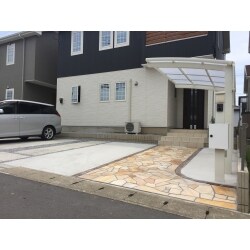 ご新築外構工事。 建売物件を購入されたご夫婦。 気に入らない部分を直したいとのことでした。 既存で2台分の駐車スペースは施工済みでしたので、今回アプローチ・ゲスト用駐車スペース・駐輪場をご希望でした。 またご主人様からアプローチは絶対に石貼りにしたいとの強いご要望がございました。