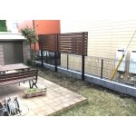 外周はリーズナブルな価格でしっかり境界を区切るメッシュフェンスを採用。 目隠しフェンスは木調のアルミフェンスをご提案しました。 コストを考えた素材選びでメリハリのあるお庭になりました。