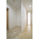 玄関扉を取付、玄関部分にはフリーな収納スペースを設けました。 ベビーカーを置いてもいいし、棚を置いて靴を置いてもいいし、ハンガーパイプを置いてコート類も置けます。使い方は入居者の方次第ですね。