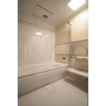 1坪タイプの広々としたユニットバス。アクセントパネルや換気乾燥暖房機も完備してあります。 ベース賃貸なので、体の大きな方でもゆったり入れるように広めのバスルームです。