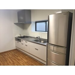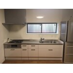 設備を新規にすると同時に、現状使われていない勝手口を無くし、冷蔵庫のスペースを設けることにより広いキッチンスペースをご提案しました。 吊戸棚も未使用だった為、取り外し解放感を出しました。