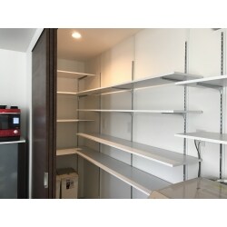| その他採用機器・設備 | 可動棚 ・ロイヤルレール(ステンレス製) L=1,800 ・棚受け金具 D450用 ・棚受け金具 D300用 ・棚板 900×450×16mm ・棚板 1,800×300×16mm ・棚板 900×300×16mm 下地 ・パナソニック スマート幅木 QPE1102PY しっくいホワイト柄 |