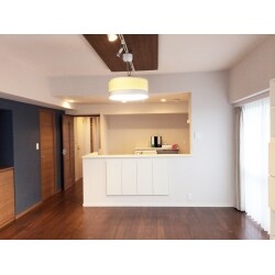 濃紺のアクセントクロスと、木目調の壁・ダークブラウンのフローリングで、ぬくもりを感じられるリビングになりました。 また、壁面収納を造作し、照明はスポットライトと、デザイン性が高く脱臭機能付きのペンダントライトを取付けました。 床暖房を設置して、快適で落ち着ける空間になりました。