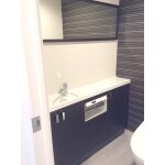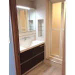 カウンターとつなぎ目のない大き目洗面ボウルと、ホース収納式水栓になりましたので、お掃除しやすく、使いやすくなりました。鏡の裏にも収納があり、また可動式収納も増設し、収納が増え、洗面スペースがすっきり片付くようになりました。扉カラ―はダークブラウンで、シックでおしゃれな洗面になりました。