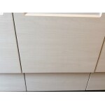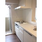 ワークトップや扉、シンク、ガスレンジカラーは、白とベージュを選び、明るいキッチンになりました。 背面にも収納を設置し、収納力アップしました。