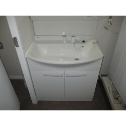 洗面台にはPanasonic エムライン(三面鏡)を 採用致しました。 既設洗面台は前面のワイド寸法の都合上、 脇にあるトイレ出入口にはみ出しておりましたが、 ご提案製品は楕円型で両端の奥行寸法が小さくなったので、 トイレへの出入りもしやすくなったかと思います。 配管類は既設再利用ですが、 床のクッションフロアを張替えて、 建具枠や木製巾木は塗装を施しました。