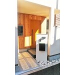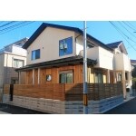 木を基調とした外構は、白い外壁に木目がアクセントになってお洒落に仕上がりました。玄関ドアとフェンスカラーを統一しナチュラルに景観に溶け込んでいます。