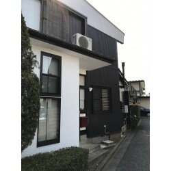 板張りの外壁を金属サイディングにリフォームしました。全面に金属サイディングを施すのではなく、サイディングは部分的に用いて、塗装と組み合わせて仕上げました。