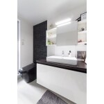 よくみられる日本の住まいとは異なるサニタリーは、トイレと洗面と浴室が同じ空間に。もちろん湿気を伴う浴室に扉はありますが、ガラス張りでオープンな雰囲気の浴室となりました。 壁付だったキッチンはL字のペニンシュラ・対面型になり、よくご両親のもとを訪れる娘さんたちと一緒に料理を作ったりホームパーティを開いたりとライフスタイルにあったものにいたしました。