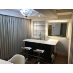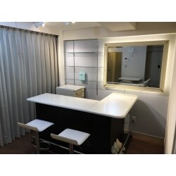 サロンのレセプションのスペースにする為キッチンスペースはカーテンで隠し商品を見せるディスプレイ棚を設置し間接照明をミラーに取り付け華やかさを演出しました