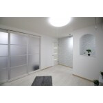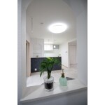 お部屋全体はホワイトを基調に、キッチン前面の壁にアクセントクロスを採用。清潔感があり、モノトーンでスタイリッシュな雰囲気に仕上げました。 玄関脇の間仕切りにはカウンターを作成。ちょっとした小物置きにも使えます。
