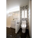 まるでホテルのようなトイレ空間に仕上げました。黒系のタイルと、トイレ背面のアクセントクロスでハイクラスな印象に。