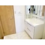 スペースを有効的に使い、以前より広い洗面台に替えました。三面鏡の全ての裏と、洗面台横にも収納があり、引出し収納になったので、すっきり片付くようになりました。フロアタイル・クロスも交換し、明るい洗面室になりました。