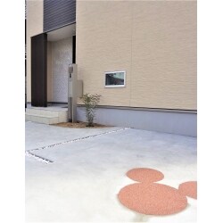 コンクリート駐車場に左官洗い出しで型をデザインすることをご提案。フェンスやサインポストとのトータルコーディネートをおすすめしました。