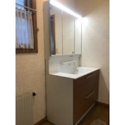 多くの収納と取りやすさを1番に考え、引出しタイプで鏡は3面鏡と、より多くの収納が出来る商品を選びました。水栓も自動水栓にし洗面台と鏡の間にジョイントが無いタイプなのでカビにくく汚れが付きにくい商品を選ばれました。