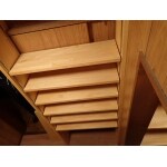 幅1.7m、奥行き60cmの固定木製デスクを設置。デスク板にはコンセント用の穴を2箇所設けました。デスク背面にはA4ファイルの書類が沢山収納出来る可動棚を設置しました。出入り口の引き戸と干渉する為、扉引込箇所でもA4ファイルが収納出来る棚奥行寸法で計画しております。