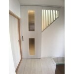 階段の前に天吊りの引き戸を設置しましょう。色は主張のないホワイトにしてチェッカーガラスで意匠性と採光を確保することで圧迫感が出ないようにしましょう。