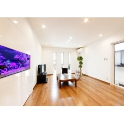2階のものを1階に移して、ご高齢の両親も過ごしやすい間取りを提案させていただきました。 サンゴ礁がお好きとの事でしたので、壁に水槽を埋込み、シンプルさを強調させつつも主張のあるデザインを提案。