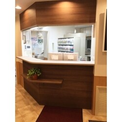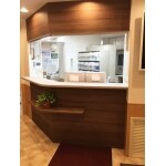 ・受付カウンター 間取りを変更することで、広々と使えるように工夫しました。 ソファーもゆったりと座れる大型のものを採用しました。 ・インテリア 従来の待合スペースは、緑と白を基調とした内装でした。 今回の計画では、受付カウンターを高級感のある人工大理石カウンターとダークウッドの内装材で作製。 内装も落ち着いた色・デザインを採用。 全体的に落ち着きのある待合スペースに仕上がりました。