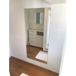 洗面室に、お客様支給の鏡2枚を設置しました。鏡を設置することで空間が明るくなり、広く感じられるようになりました。 また、お風呂の換気扇は以前の換気扇サイズが異なっていたため、調整して正規サイズを設置しました。