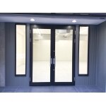 事務所入り口なので、中が見えて、明かりも取り入れられる透明ガラスのドアを採用しました。タイルは、シックなカラーで滑り防止のザラメ状の粒を表面に施したものを採用しました。