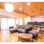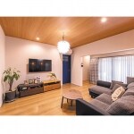 洋室・縁側との仕切りを取り払い、現代的で広々としたLDK。奥様の明確なイメージを形にしたスカンジナビアモダンのリビングは、木目調と落ち着いた色合いの中に、鮮やかな色(クラフトタイル・ドア)がスパイスとして効いています。 断熱性能も向上し、冬の寒さ対策のため床暖房を取り入れました。 キッチンは、奥様チョイスの深海色のクラフトタイルが美しい。 ダイニングテーブルの代わりにカウンターテーブルを取り付けた分、ゆとりが生まれ、ゆったりとしたリビングとキッチンの通路になりました。キッチンに、3人ほど立っても余裕があります。動きやすくなり、家事効率も向上。 窓側には、室内干しスペースを設け、家事ラクにも、花粉症対策にもなりました。