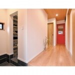 奥様の要望を叶えるドアは、プレイリーホームズのジーピードアを採用。豊富なデザインからお好みのデザイン・樹種を選んでいただき、ご希望の色で塗装しました。鮮やかな赤色のドアは、玄関からの景色に明るさと華やかさを与えます。 少し赤みを帯びた天井・床材、黄みがかったドア、異なる木目調とも調和しています。 廊下は、花を飾ったり、季節のアイテムを置いたりと、家族やお客様をもてなす場所でもあります。さりげなく、毎日のワクワク感を高めてくれる空間になりました。