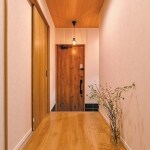 パイン材の木目柄が際立つ玄関ドアは、外壁の色、昭和レトロなタイルとも調和しています。ドアを取り替え、断熱性能が向上。以前の家の良さを残しつつ、現代風に生まれ変わりました。