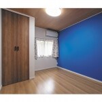 それぞれ違った表情を見せる天井・床・クローゼットのナチュラルブラウンの中に、はっと目を惹くロイヤルブルーのアクセントクロスが印象的。昼と夜、光の加減で変化するブルーを楽しめます。 物入れの場所を生かし、高さのあるクローゼットに変更。開き戸なので、全開すると中が見えて出し入れしやすくなりました。