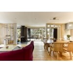 弊社からは、東南角の一番日の当たる場所に位置する18畳もの広縁と8畳の和室二間と10畳の仏間含めLDKと客間へご提案致しました。もともとの客間も広縁側へと位置を変更し、「三間続きの和室と広縁」から「33畳LDKと10畳客間」へと改装。二階を支える柱はそのままに、明るく開放的な空間づくりに工夫を凝らしています。 薪ストーブの効果が最大限発揮できる位置と外から薪を運ぶ同線も意識しつつ、乱雑になりがちな薪ストックスペースは既存柱を生かし格子で目隠し兼アクセントに。客間から一直線に広がる無垢の温かい空間が、その奥に見える庭園をどこからでも眺められるように窓開口を大きく取ったことで、開放感がありながらも落ち着く空間を演出しています。