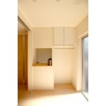 吊戸棚で収納を確保したワークルーム。日当たりもよく、ほっこりするお部屋に仕上げました。 作業しつつも、来客にすぐ対応できるよう玄関との間にカウンターを設置。 使い勝手の良いワークルームです。