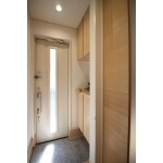 ホワイト×木目の、柔らかく暖かい雰囲気の玄関です。玄関のたたきは玉石洗い出しを採用しました。職人さんの技で、美しい仕上がりになりました。