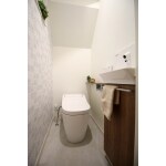 限られた敷地を活かすために、トイレは階段下に設置いたしました。トイレは節水型のオートトイレ、手洗い器の水栓もオート機能付きですので、自動で節約に貢献です!