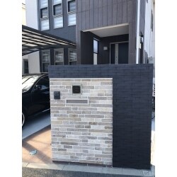 道路・交差点からの目線が気にならないよう、門柱を道路側に移動。汚れ目立たないよう暗めのトーンで考えました。