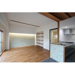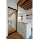 キッチンは対面式の壁付フルオープンで開放感のあるレイアウトです。笠木は本物の木を利用し、腰壁は大谷石で仕上げました。面材は重厚感のあるブラックに素材の色を活かしたステンレスカウンター、レンジフードを合わせています。キッチンと廊下の大谷石の連続性を邪魔しないよう、LDの開き扉は極限まで細くしたアルミフレームのガラスの開き扉を採用しました。扉のアルミ縦枠、笠木縦枠、大谷石の取り合いの納まりは綿密な打ち合わせと工夫により実現しています。床材はメンテナンス性に優れた石目調のフロアタイルに目地を設け、1枚1枚際立たせた張り方にしています。天井には1枚1枚色と木目が異なる本物の木の天井材で仕上げ、空間の印象に変化を与えています。