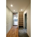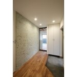 玄関入ってすぐの正面の壁はダウンライトに照らされた大谷石がダイナミックな印象を与えています。タタキはまわりのデザインを邪魔しない無機質なモルタル左官仕上げで納めています。玄関収納は下部をオープンにしたステルス枠観音開き収納扉で、内部には可動棚を備えました。