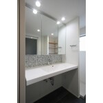 洗面台は無駄をそぎ落としたシンプルなカウンター一体式洗面ボウルを採用しました。三面鏡の下部にはアクセントとしてホワイトのガラスモザイクタイルを張りました。