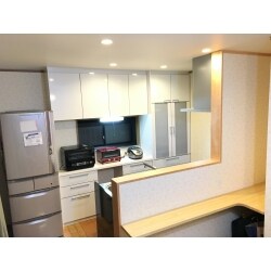 対面型キッチンにリフォーム。 元々付いてた、キッチン部分にシステム収納を設置しました。