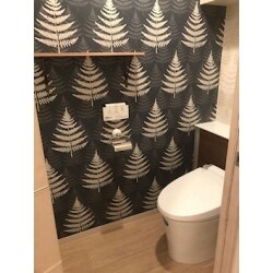 トイレ自体の清掃性はもちろん、収納や配管・配線などもすっきりとさせたいとのご要望でしたので、LIXILのリフォレを採用し、お手入れとすっきりした空間をご提案し、お客様は北欧のデザイナーがお好きだという事で、その方のデザインした壁紙を採用する事で、お客様だけのこだわりのトイレを表現しました。
