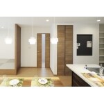 間接照明、化粧パネルを計画して、意匠性を高めました。 格子壁を利用して小上りと、入り口のドアから緩やかに間仕切り、狭く感じないように配慮しています。 キッチンからダイニングの様子をうかがえるようにプランニング致しました。